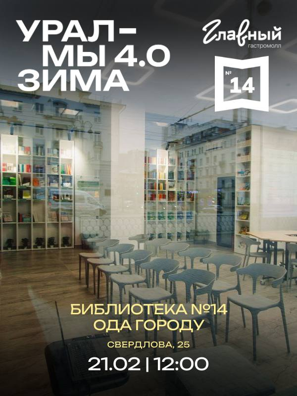 "Главный" и библиотека №14 объединяются, чтобы поговорить о городе! 🏙️ Если вы любите Урал и хотите узнать о нем больше, приходите 21 февраля в 12:00 по адресу Свердлова, 25. 📍 Будет интересно и познавательно, как будто вы прочитали умную книгу! 😉