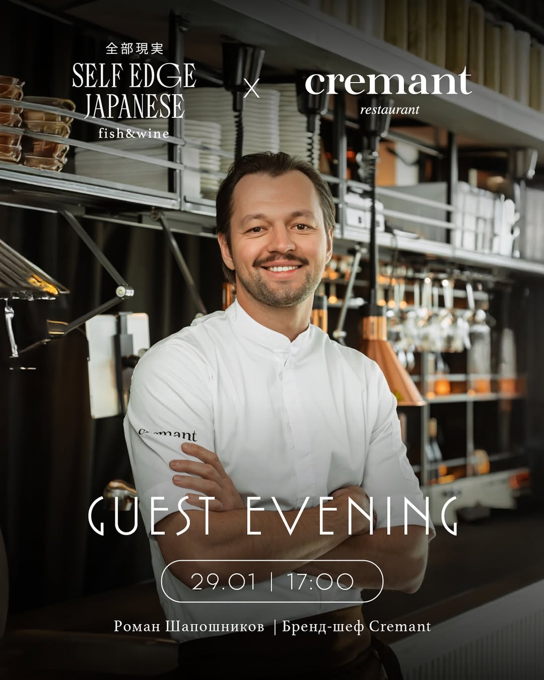 29 января в Self Edge Japanese — гастрольный ужин от Cremant с бренд-шефом Романом Шапошниковым. С 17:00 до 19:00 — французская классика: тартар по-парижски, паштет с хересом, бёф бургиньон, зелёный салат с бри и финальная «Павлова» с грейпфрутом.