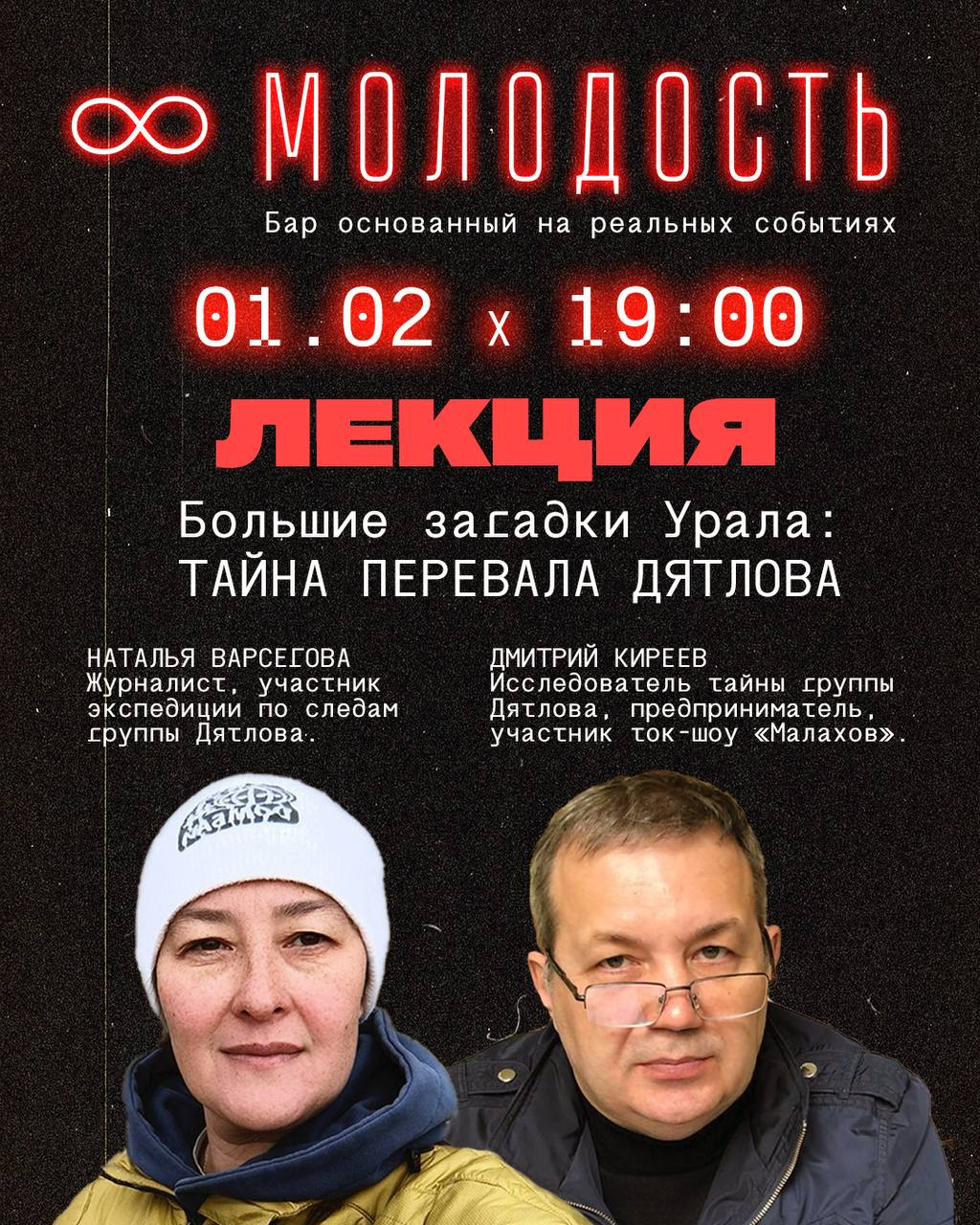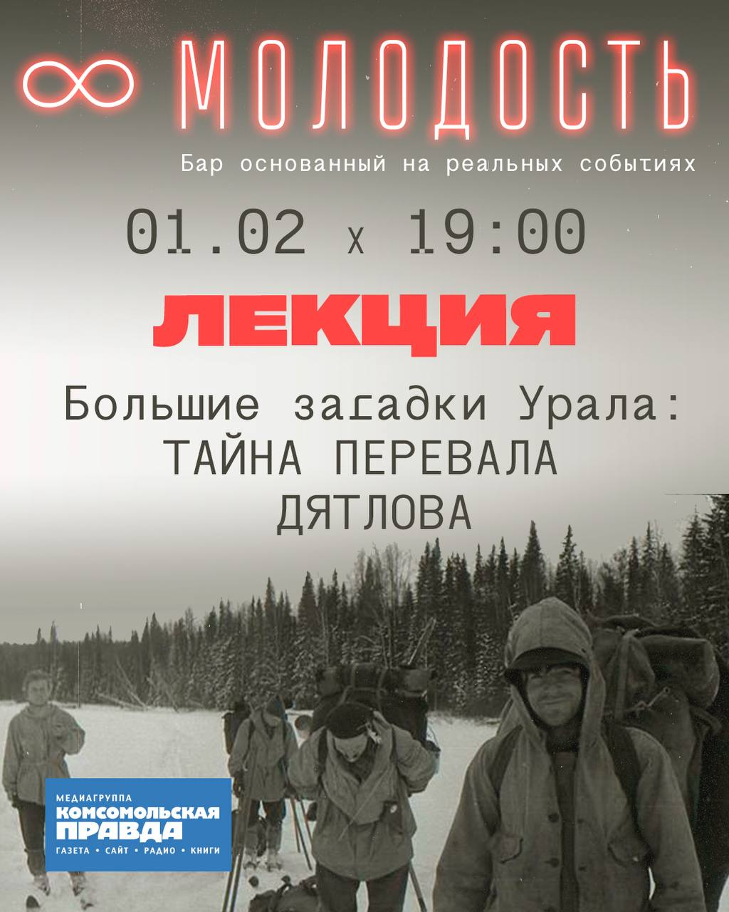 1 февраля в «Молодости» — лекция «Большие загадки Урала: Тайна перевала Дятлова». Вместе с экспертами разбираем одну из самых мрачных и обсуждаемых трагедий XX века — события ночи с 1 на 2 февраля 1959 года у горы Холатчахль.