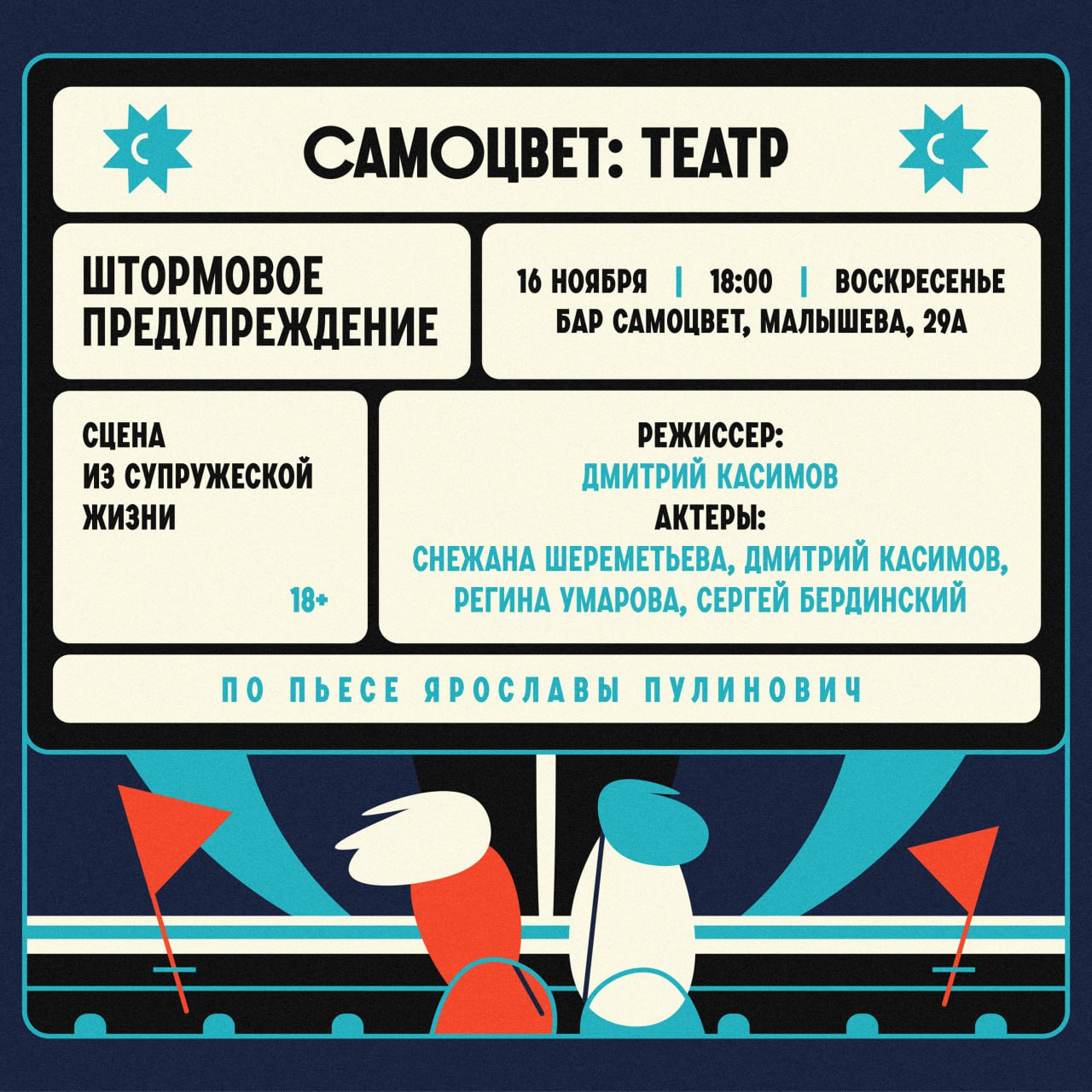 Психотерапевт c бутылкой, нарколог с романом, молодая дама на пороге — в супружеском доме надвигается не только шторм, но и честный разговор. В спектакле «Штормовое предупреждение» герои ищут спасение друг в друге и открывают, что настоящая буря всегда внутри. 90 минут драматического погружения — бери билет и готовься к неожиданным открытиям!