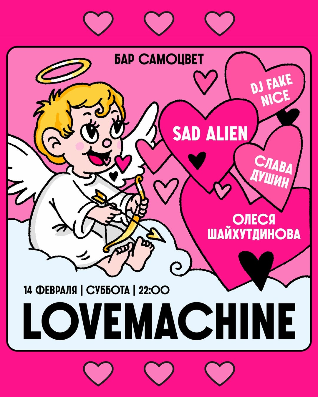 Включаем любовную машину на полную мощность! Московская подружка Sad Alien запустит "турболюбовь", и танцпол взорвётся от бойких бэнгеров и шлягеров. Завершим вечер медленными танцами для разогретых сердец.