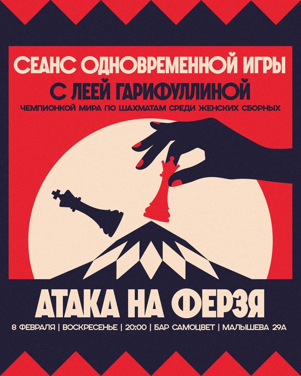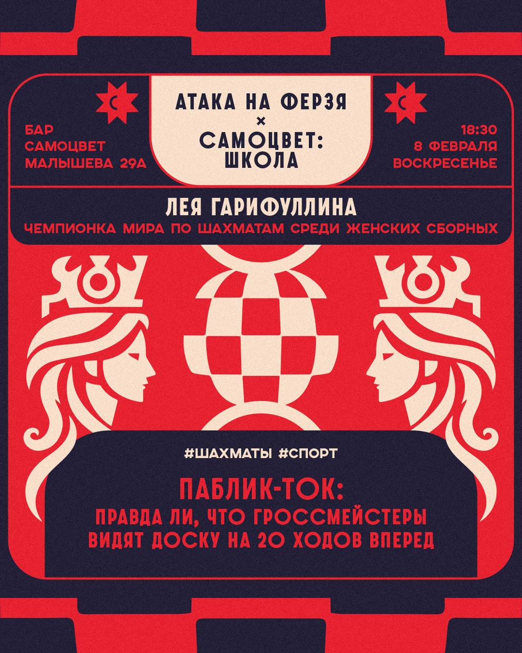8 февраля «Самоцвет: Школа» и клуб «Атака на ферзя» зовут в гости Лею Гарифуллину — чемпионку мира по шахматам среди женских сборных. Сначала — паблик-ток о том, что на самом деле происходит в голове у профи: мифы, реальность, ошибки и решения за секунды.