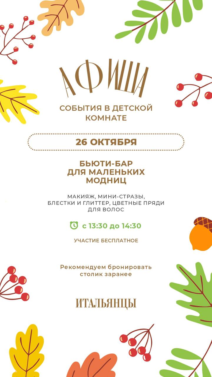 "Итальянцы" приглашают на бьюти-бар для маленьких модниц! 26 октября с 13:30 до 14:30 макияж, мини-стразы, блестки и цветные пряди для волос! 💋 Участие бесплатное, но рекомендуем забронировать стол заранее! 😉