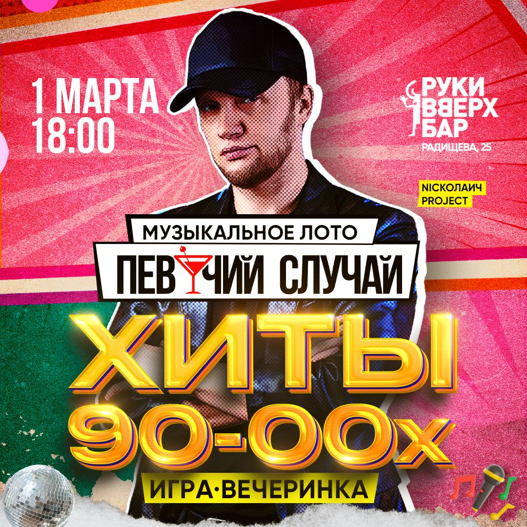 1 марта в баре Руки Вверх играем в музлото с песнями, под которые когда-то стирали плёнки и забывали про будильник. 70+ хитов от Руки Вверх!, t.A.T.u., «Зверей», «Дискотеки Аварии» и всей той золотой обоймы — поём, зачеркиваем, берём призы.