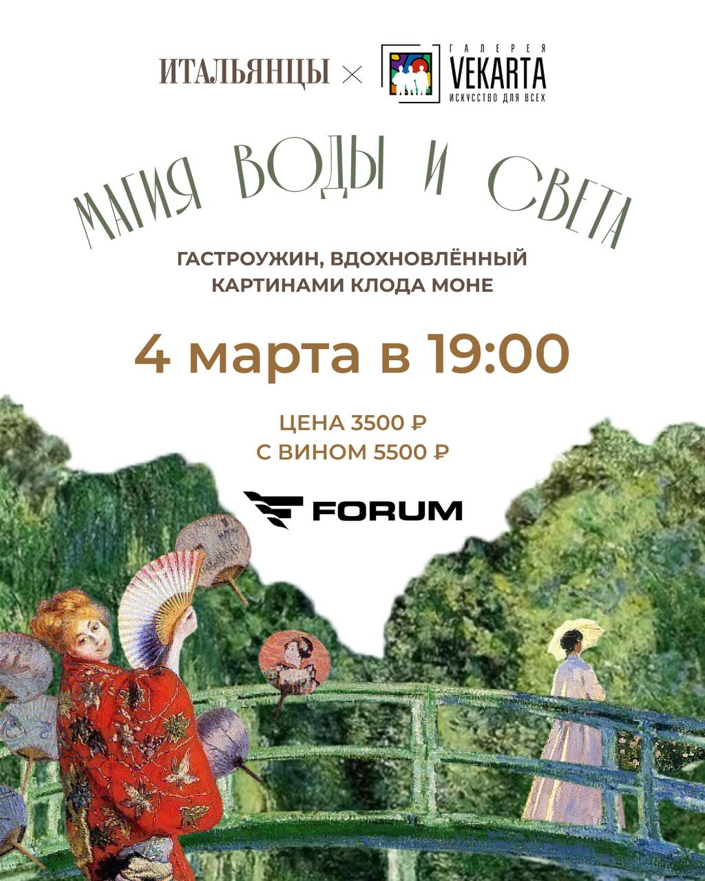 Ресторан "Итальянцы" и галерея VEKARTA приглашают на ужин, где живопись Клода Моне оживет во вкусах! 🍽️ Цукини с трюфелем, "Сады Моне" с фуа-гра, мидии в сидре и клубничное парфе – все, чтобы почувствовать себя импрессионистом! 🤩 Цена вопроса: 3500₽ (без вина) или 5500₽ (с вином). 🍷 Количество мест ограничено, так что бегите за билетами! 😉