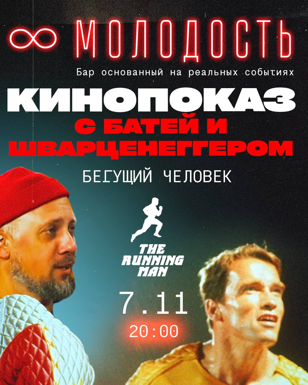 К мировой премьере нового фильма по Кингу — показ самой классической версии, где Арнольд бегает за жизнь под камеры и крики толпы. Отличный повод вспомнить эпическую 80’s атмосферу, а ещё урвать уникальный мерч по стилистике смертельного шоу: всего 12 экземпляров! Бронируй — билет и редкий шанс на стиль.