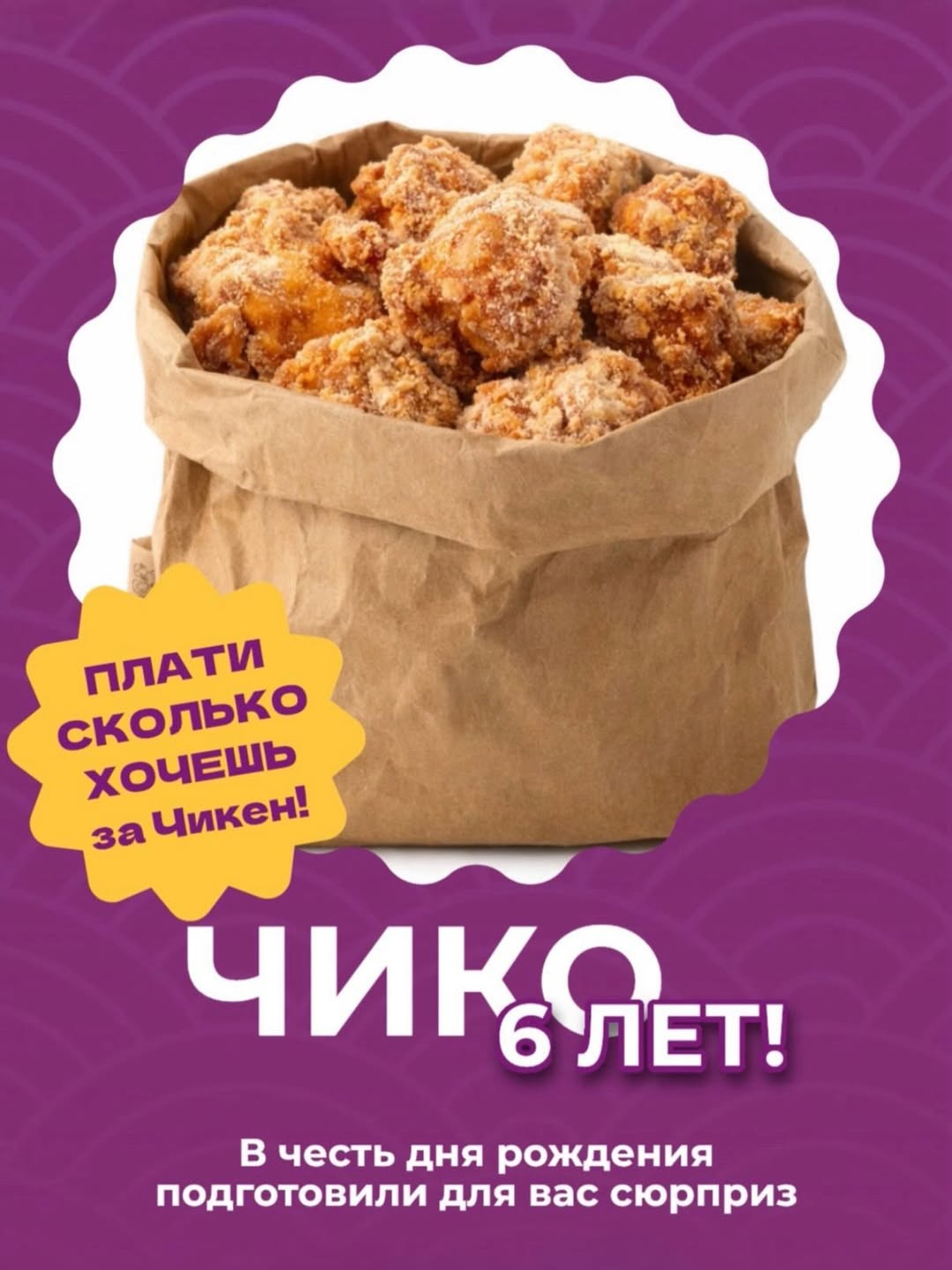 15 января ЧИКО исполняется 6 лет — и в честь дня рождения здесь делают то, что обычно запрещено здравым смыслом: за легендарный чикен можно заплатить любую сумму 🍗😎