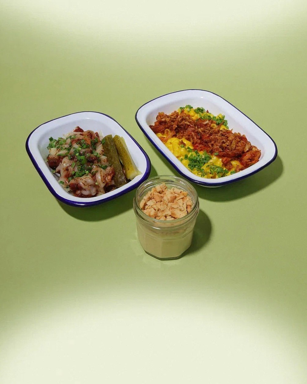 - Рожки с жжёной свининой: рожки, свинина и два соуса — барбекю и малина-бекон. Сверху зелёный и фри лук. 🍝