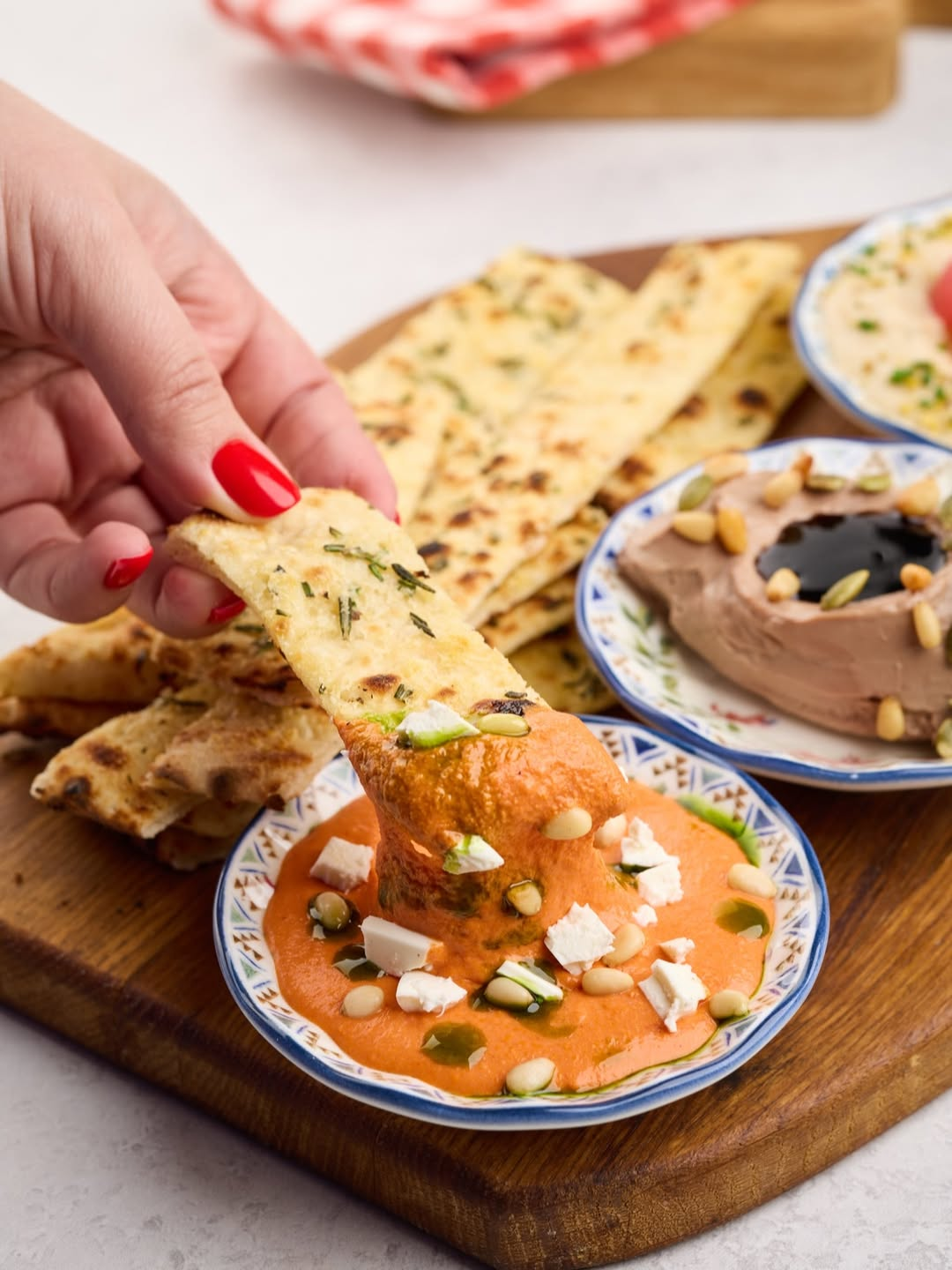 Печёная паприка, куриный паштет, крум из баклажана и тёплая фокачча удобно встают в центр стола и исчезают быстрее, чем неловкие паузы в разговоре.