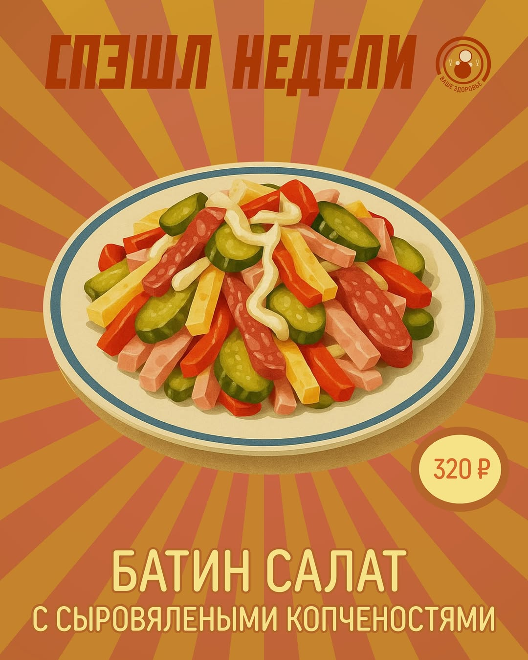 На этой неделе в меню — салат от бати! Сыровяленые копчёности, зелень, капелька майонеза и всё это с характером, но без лишней показухи. А чтобы разговор шёл живее, не забудь про стопочку настойки! 😉